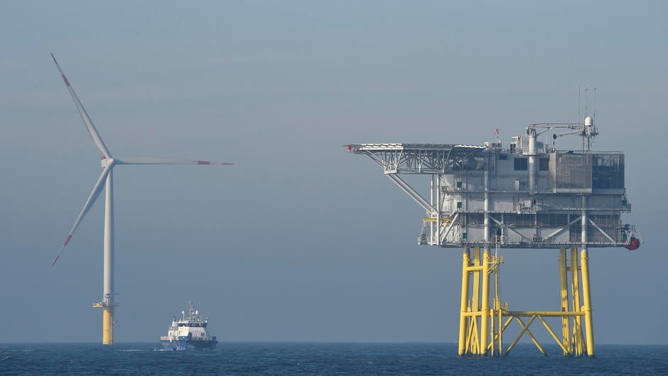 Europe is very active in the development of offshore . The development of offshore wind farms should enable European countries to achieve their stated " " ambitions. The UK is the leader in terms of installed offshore capacity (22 GW by 2022), followed by Germany (8 GW by 2022). France, for its part, has launched numerous tenders, and its first offshore wind farm (0.5 GW), built off Saint-Nazaire, will be operational by 2022. The photo shows a wind turbine next to a substation at a wind farm off the German North Sea island of Helgoland.